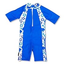 A aqua blue front zippered SUN PROTECTIVE Body Suit with Hibiscus Flower design on 2 side stripes. Front zippers are easier for children to use than back zippers! Cover them up with this 1 piece 98% UV blocking swimsuit to reduce the sun's harmful UV Rays. These swimsuits are lightweight and fast drying with a UPF (Ultraviolet Protection Factor) of 50.
